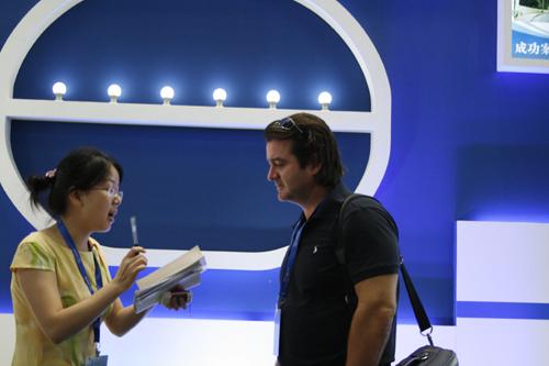 照明外貿(mào)人員專心介紹球泡、射燈產(chǎn)品參數(shù)